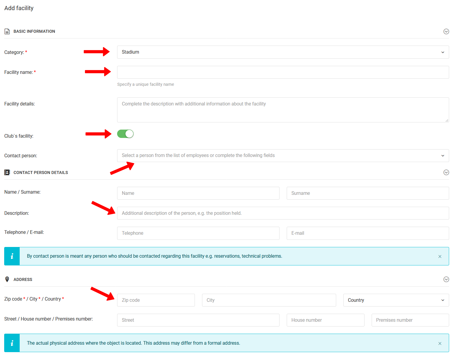 Ve formuláři máte několik důležitých polí k vyplnění. Prvním je výběr typu zařízení. Můžete si vybrat mezi stadionem, tréninkovým centrem, školou atd. Dalším polem k vyplnění je název a popis zařízení. Poté určete, zda zařízení patří klubu, pokud ano, vyberte kontaktní osobu, pokud ne, zadejte údaje o vlastníkovi zařízení a kontaktní osobě. V posledním kroku vyplňte úplnou, přesnou adresu zařízení, které zadáváte do systému.