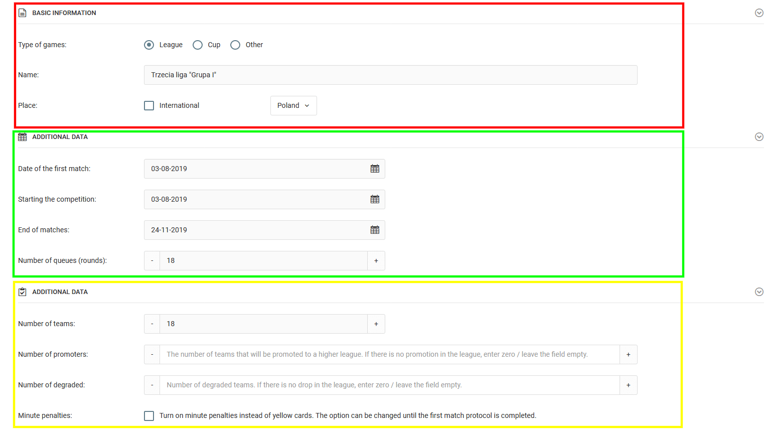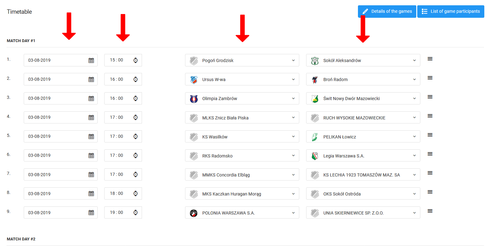 Posledním krokem při vytváření her je vytvoření seznamu zápasových dvojic pro každé kolo hry. Můžete to udělat najednou nebo to rozdělit do etap. Pro každý zápas musíte nastavit čtyři prvky: datum, čas, domácí tým a hostující tým. Je výhodné uspořádat účastníky zápasu, protože jednou vybraný tým už nemůže být vybrán znovu v rámci jednoho kola zápasů. Tímto způsobem se vyhnete chybám při plánování zápasů.