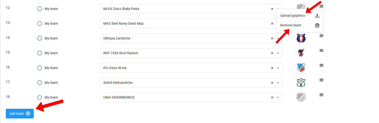 Po zadání základních údajů o hrách je čas na další krok. Doplňte seznam týmů účastnících se her. Kromě zadání názvů týmů budete moci přidat i jejich znaky. V tomto okně budete také moci odstranit nebo přidat tým do seznamu účastnících se týmů.