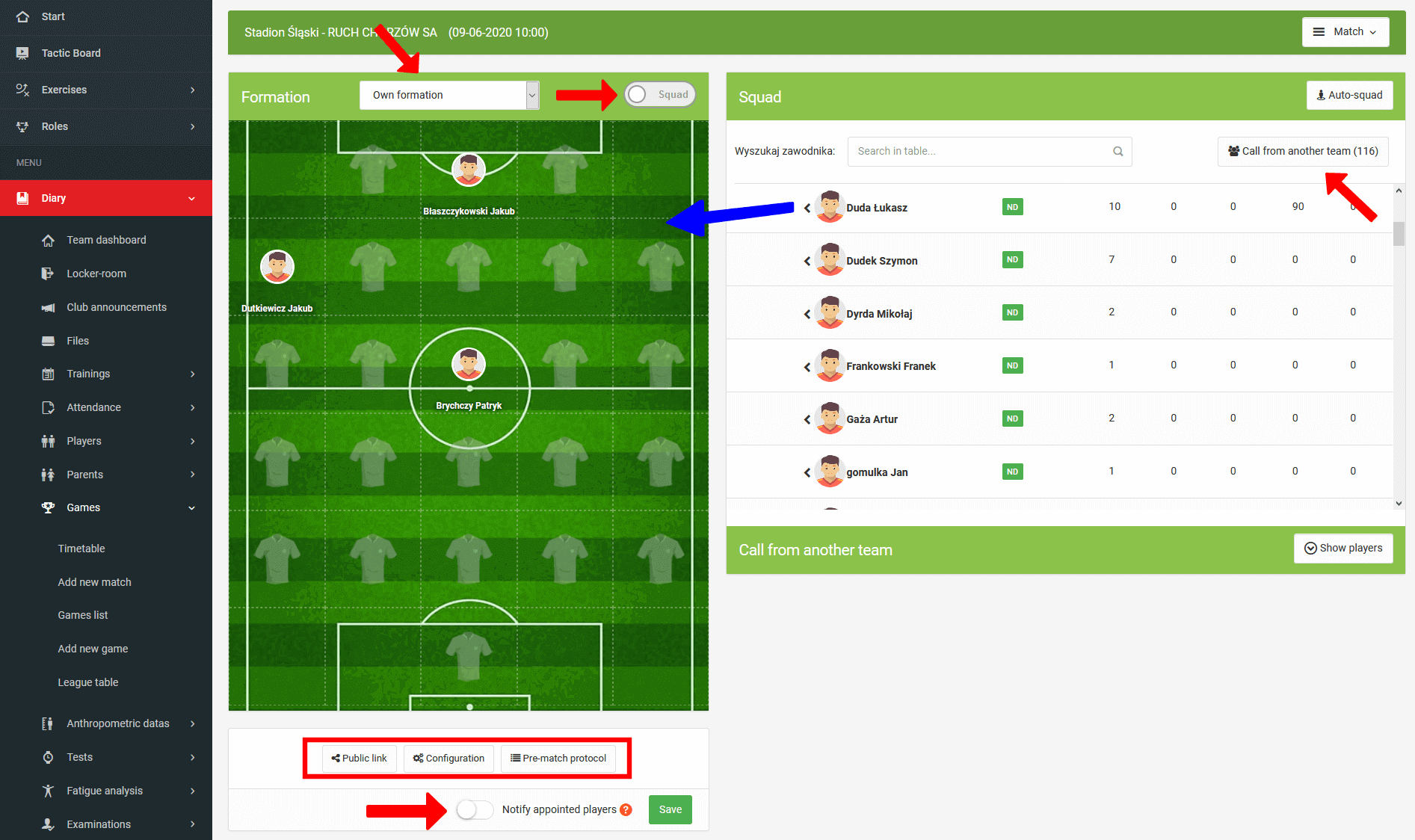 Okno sestavy zápasu kromě volby základní sestavy a lavičky náhradníků nabízí mnoho dalších možností. První je možnost umístit na hřiště předdefinovanou formaci. Systém také umožňuje povolat hráče z jiných týmů. Chcete-li to udělat, klikněte na tlačítko "povolat z jiného týmu" a přetáhněte vybrané hráče na hřiště.
