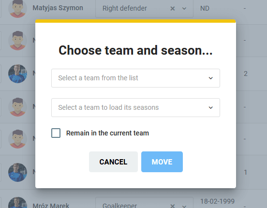 Když tuto možnost vybereš, budeš muset specifikovat tým, do kterého chceš hráče přesunout, a sezónu, ve které se má hráč v novém týmu zobrazit na seznamech.