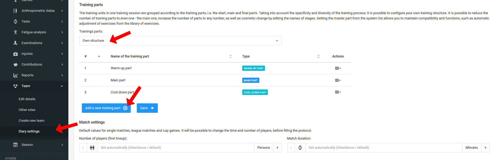 Systém vám dává možnost vytvořit vlastní strukturu návrhu. Ve výchozím nastavení jsou v návrhu tři části tréninku: úvodní, hlavní a závěrečná část. Díky této funkci můžete nastavit libovolný počet a pořadí tréninkových částí. Části lze nastavit na úrovni klubu a pak je zdědit týmy nebo vytvořit individuálně pro konkrétní tým. Vlastní strukturu návrhu můžete nastavit v záložce deník tým nastavení deníku.