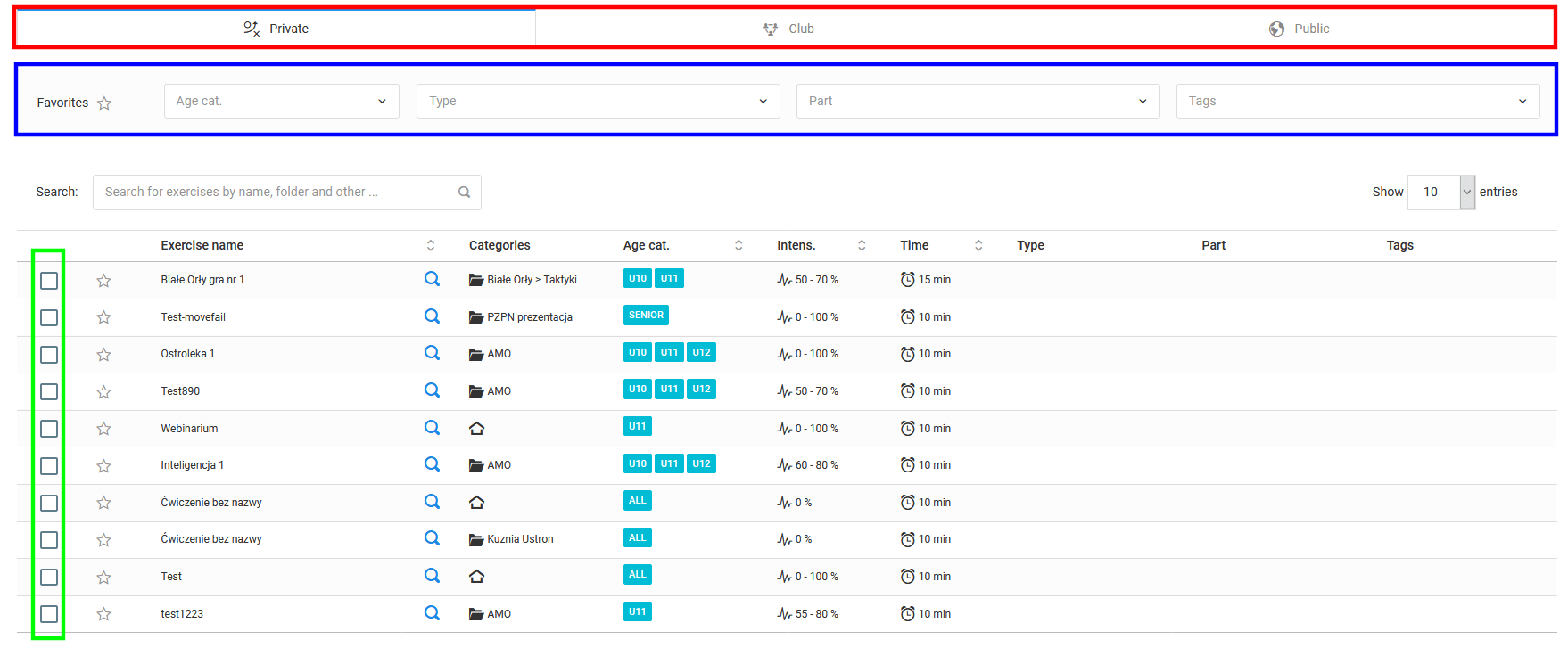 Okno pro přidávání cvičení se skládá ze čtyř hlavních prvků. První (červený) je seznam dostupných knihoven. V závislosti na vaší licenci to mohou být dvě, tři nebo dokonce čtyři knihovny. Dalším prvkem (modrý) jsou filtry, díky nimž budete moci najít cvičení, které vás zajímá. Dalším prvkem (zelený) jsou zaškrtávací políčka, která vyberete pro přidání cvičení do návrhu. Zbývající oblast je seznam dostupných cvičení s jejich parametry.