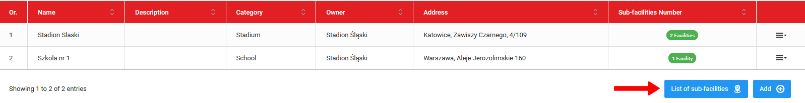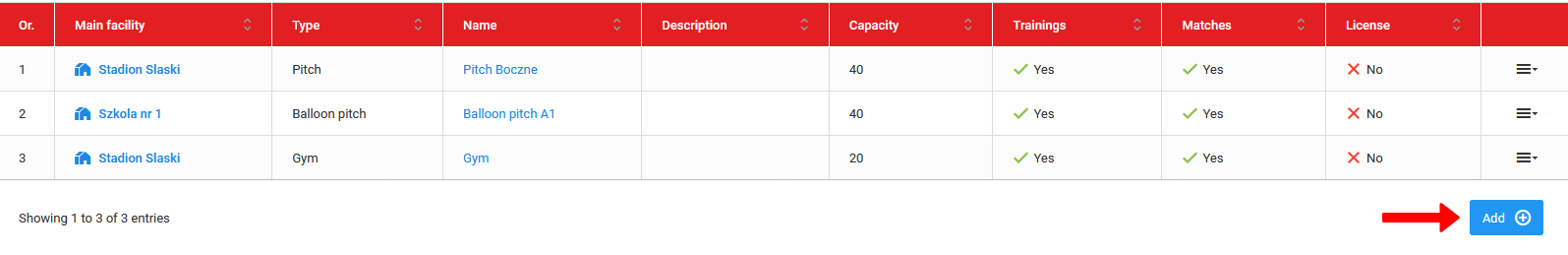 Um eine Teileinrichtung zur übergeordneten Einrichtung hinzuzufügen, gehen Sie zur Liste der Teileinrichtungen und klicken Sie auf die blaue Schaltfläche "Hinzufügen". Sie können beliebig viele Teileinrichtungen in einer bestimmten Einrichtung hinzufügen. Denken Sie daran, dass Sie beim Hinzufügen einer Trainingseinheit oder eines Spiels den Ort aus den Teilobjekten auswählen werden.