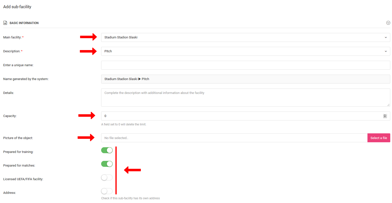 Nach dem Klicken auf Hinzufügen gelangen Sie zum Formular zum Hinzufügen einer Teileinrichtung, wo Sie mehrere wichtige Felder ausfüllen müssen. Das erste Element besteht darin, die übergeordnete Einrichtung und die Kategorie der Teileinrichtung zu bestimmen. Sie können aus der Liste wählen: Spielfeld, Schwimmbad, Halle, Umkleideraum oder Fitnessstudio. In den nächsten Schritten vervollständigen Sie den Namen und die Beschreibung der Teileinrichtung, geben die maximale Personenzahl an, fügen ein Foto hinzu und andere Parameter der Teileinrichtung. Wenn sie eine eigene Adresse hat, können Sie diese auch hinzufügen.