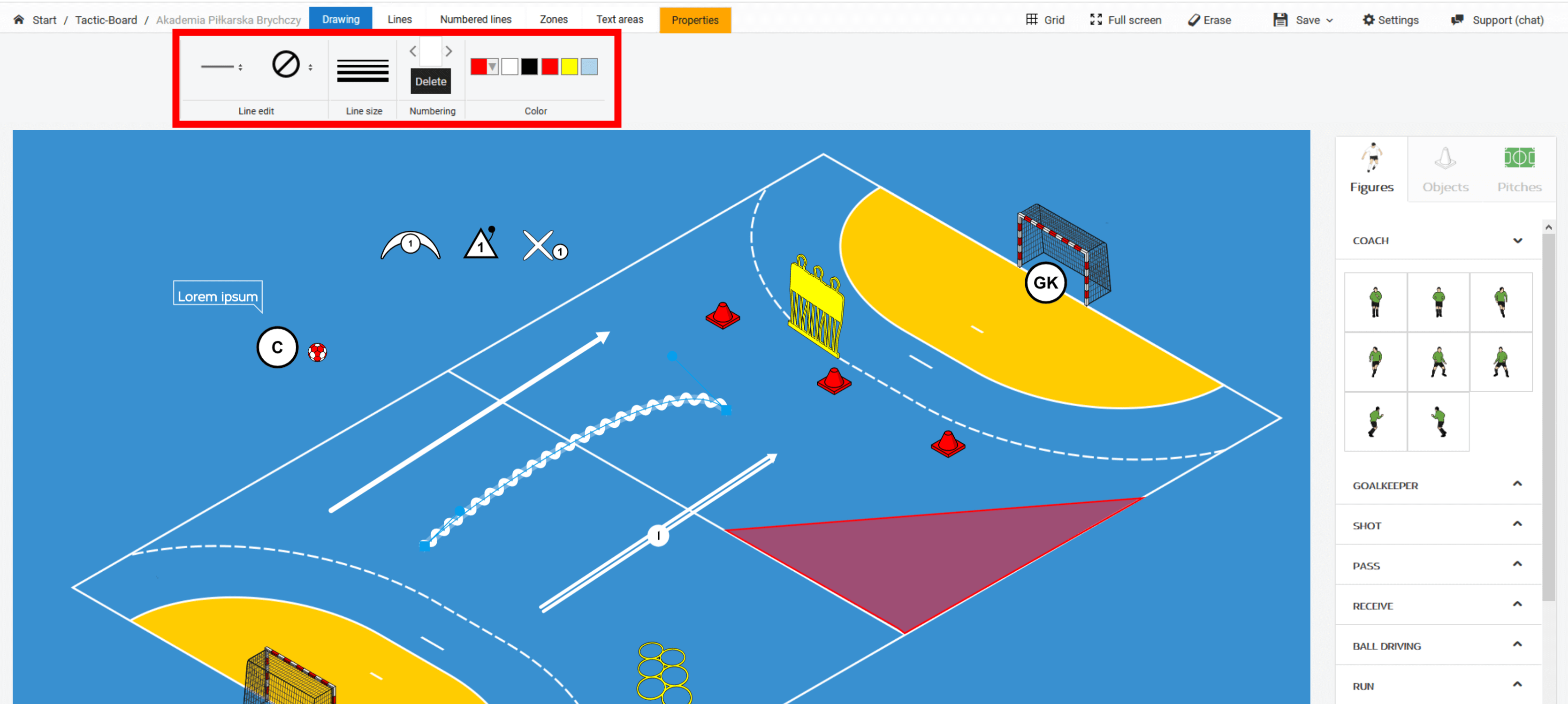 Le processus de dessin nécessite la boîte à outils supérieure et le menu de droite. Le menu de droite est responsable de l'ajout d'éléments au terrain. Ici, vous avez le choix entre des éléments tels que les terrains, les joueurs et l'équipement. Chacun d'eux est transféré vers le terrain en sélectionnant et marquant l'endroit sur le terrain où il doit apparaître. La barre d'outils supérieure est utilisée pour sélectionner les lignes, les zones et les zones de texte. Après la sélection de l'objet, les propriétés de l'objet apparaîtront en cliquant dessus avec la souris. Là, vous pouvez changer : la taille, la couleur et d'autres paramètres caractéristiques pour un objet donné. Pour supprimer un objet, cliquez dessus avec le bouton droit et sélectionnez l'option supprimer dans le menu contextuel. La deuxième façon est de cliquer sur le bouton supprimer de votre clavier.