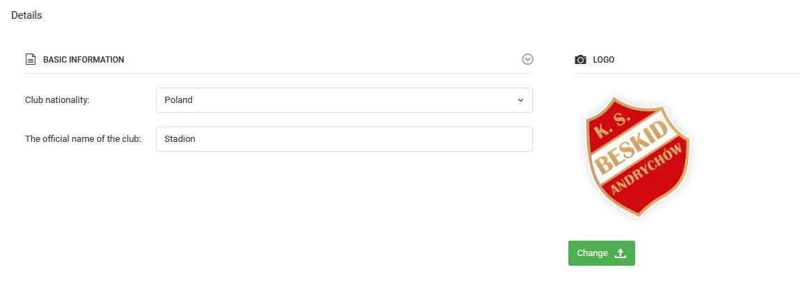 Pour accéder au profil de l'entité/club, allez au menu de gauche club paramètres profil. Vous pourrez saisir ou modifier des données telles que le nom officiel de l'entité, le pays et l'écusson. De plus, en bas de la page vous pouvez remplir des coordonnées plus détaillées telles que l'adresse de l'entité, le téléphone de contact ou l'adresse e-mail.