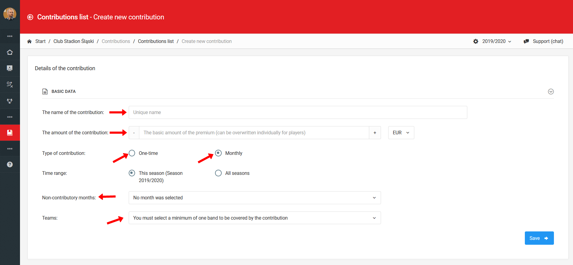 Het systeem geeft de mogelijkheid om twee typen contributies te creëren: een eenmalige contributie en een maandelijkse contributie. Voordat je contributies maakt, is het een goede praktijk om het proces van het opstellen van de spelerslijsten voor elk team te voltooien en een actief seizoen aan te maken voor alle teams. Zonder het aangemaakte seizoen kun je geen contributie toewijzen aan een team. Het maken van een contributie is mogelijk zowel vanuit het niveau van de coach als de beheerder van het clubaccount. Door een contributie te maken als coach, kun je deze alleen toewijzen aan het team dat je leidt. Door dit als beheerder te doen, kun je een contributie voor alle teams tegelijk maken. Om naar de contributiecreatie te gaan, selecteer als coach uit het linkermenu dagboek contributies nieuwe contributie maken. Als je een contributie wilt maken vanuit het beheerdersniveau, kies uit het linkermenu club contributies nieuwe contributie maken.