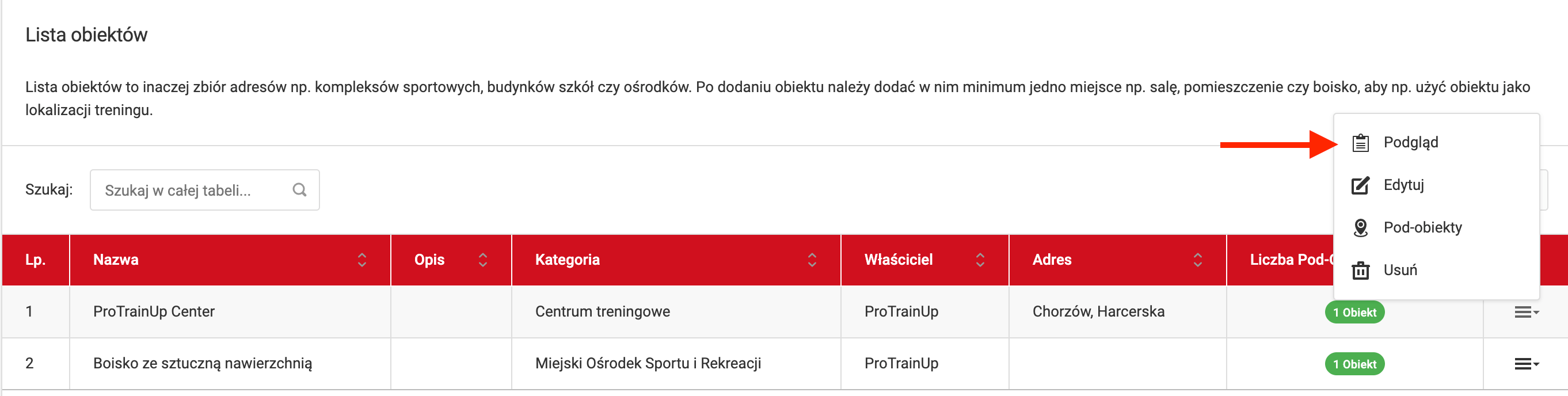 Aby podejrzeć dany obiekt wejdź w lewym menu w klub obiekty i rezerwacje lista obiektów i wybierz z menu (ostatnia kolumna) przy danym obiekcie pozycję "podgląd". Z tego też menu masz możliwość edytować oraz usunąć dany obiekt.