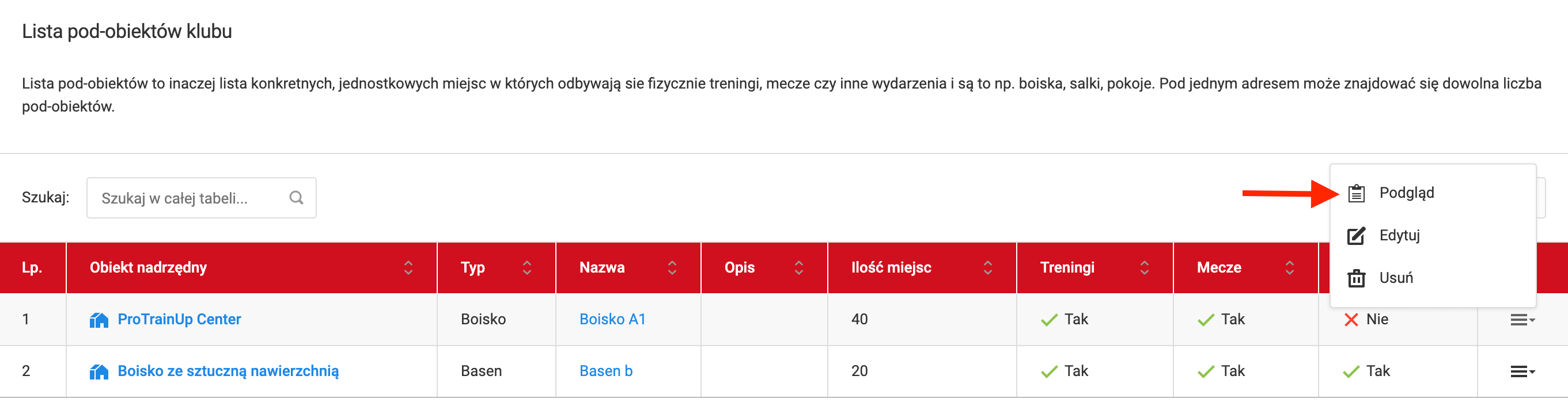 Aby podejrzeć dany obiekt wejdź w lewym meny w klub obiekty i rezerwacje lista pod-obiektów i wybierz z menu (ostatnia kolumna) przy danym obiekcie pozycję "podgląd". Z tego też menu masz możliwość edytować oraz usunąć dany pod-obiekt.