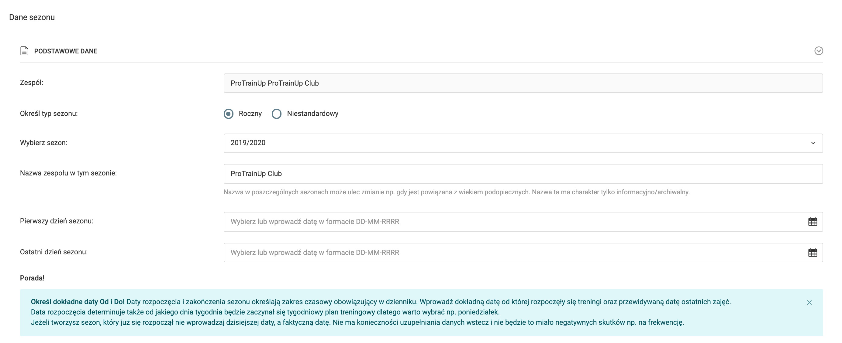 Aby utworzyć sezon w systemie, należy kliknąć w lewym menu dziennik sezon dodaj sezon. Otworzy Ci się formularz tworzenia nowego sezonu. Znajdziesz tam kilka pól do uzupełnienia, zaczynając od wyboru z listy sezonu np. 2020/2021, następnie ustalamy nazwę naszej drużyny w tym sezonie oraz wybieramy datę rozpoczęcia oraz zakończenia sezonu. Zalecamy tworzenie sezonów rocznych, jednakże system pozwala w wyjątkowych sytuacjach dodawać także sezony krótsze nazywane niestandardowymi.