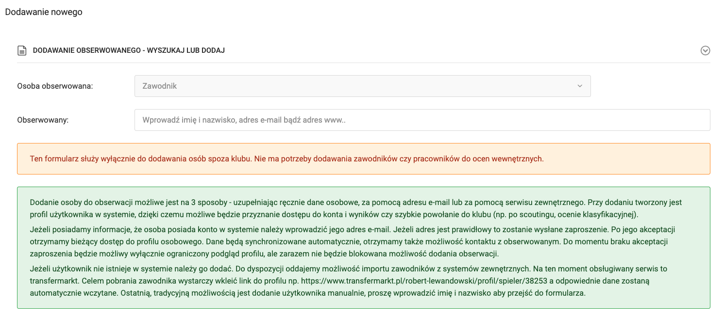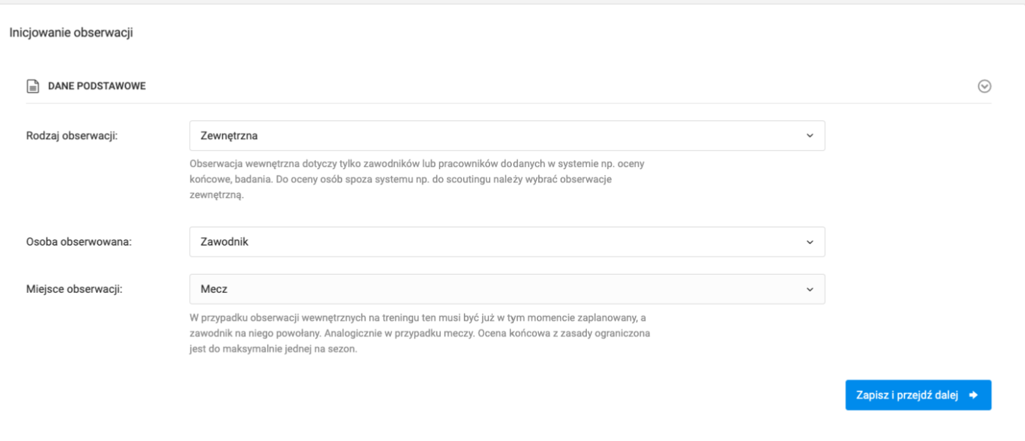 W przypadku obserwacji wewnętrznej będziesz miał do wyboru wyłącznie zawodników/pracowników swojego klubu. Po określeniu wszystkich parametrów, kliknij w przycisk „zapisz i przejdź dalej”.