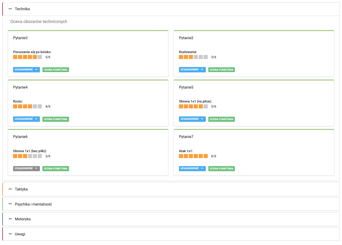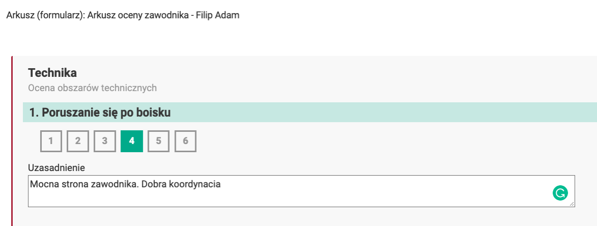 W zależności od formy przygotowanych w formularzu pytań, będziesz mógł odpowiednio wprowadzać odpowiedzi na pytania postawione w formularzu. Na powyższym obrazku mamy przedstawione pytanie złożone z dwóch elementów. Takie zestawienie pytania pozwala oznaczyć ocenę danego elementu wraz z uzasadnieniem tekstowym. Pytania w formularzu mogą być poukładane kategoriami, które nawiązują do utworzonych podczas tworzenia arkusza zakładek. Po zakończeniu uzupełniania formularza, kliknij w zielony przycisk „zapisz”.