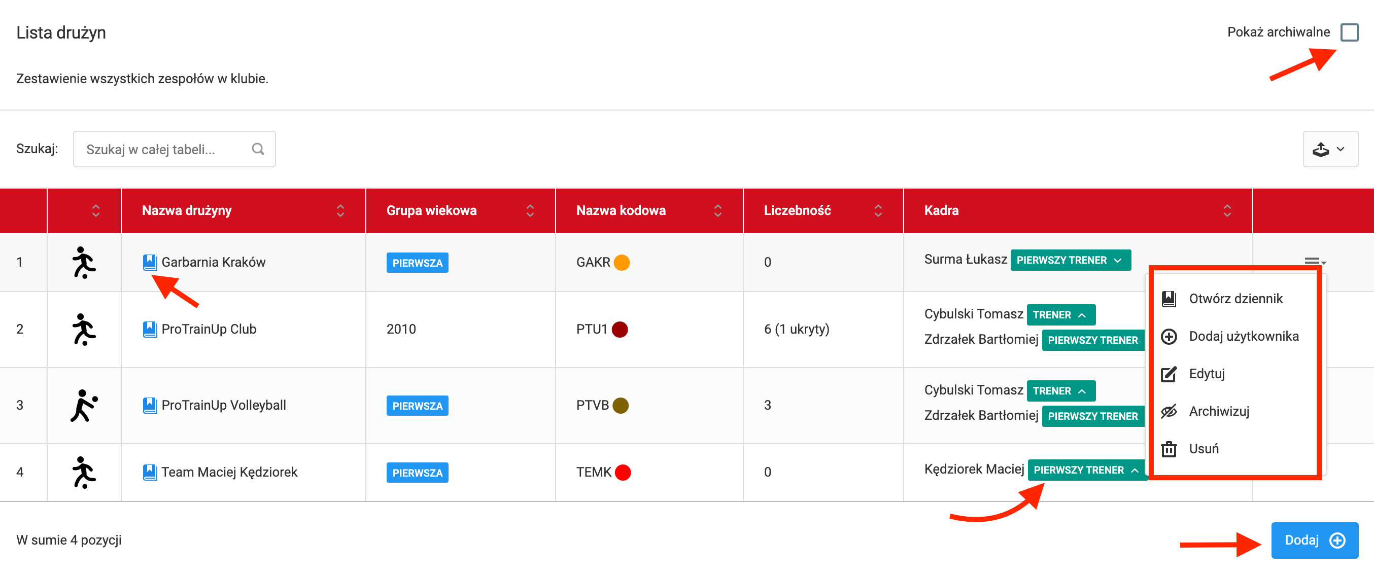 Jeżeli jakaś drużyna zakończy już pracę w Twoim klubie (najstarszy rocznik), ale nadal chcesz zachować ich archiwalne dane, wybierz z menu opcje "archiwizuj". W każdej chwili będziesz miał możliwość wrócić do historycznych danych tej drużyny, zaznaczając w prawym górnym rogu pole "pokaż archiwalne". Aby trwale usunąć z systemu drużynę, w pierwszym kroku odepnij od niej wszystkich trenerów. Następnie wybierz z menu danej drużyny opcję "usuń". Temat dodawania drużyn został już poruszony we wcześniejszych rozdziałach tego przewodnika.