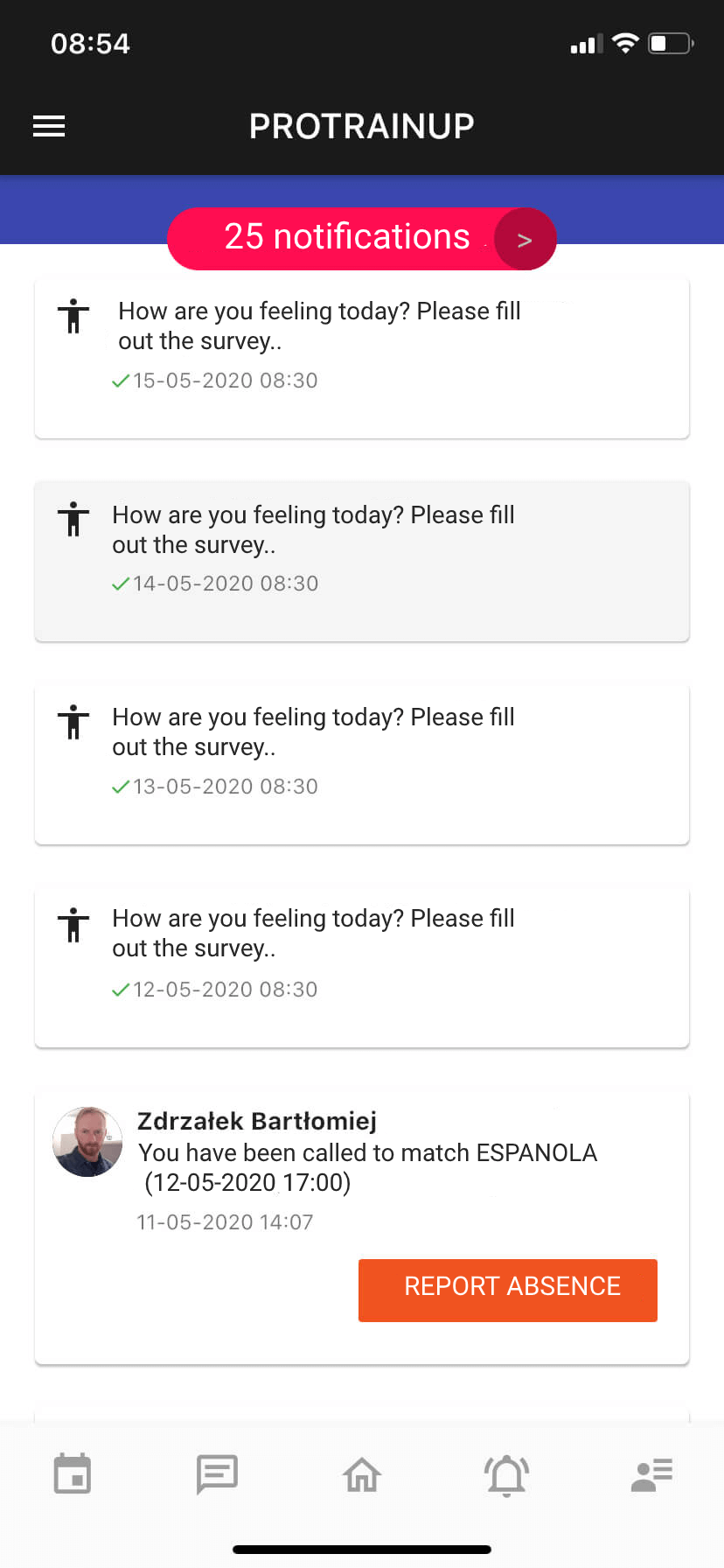 - повідомлення про відсутність батьків / гравців на тренуванні / матчі (тренер),